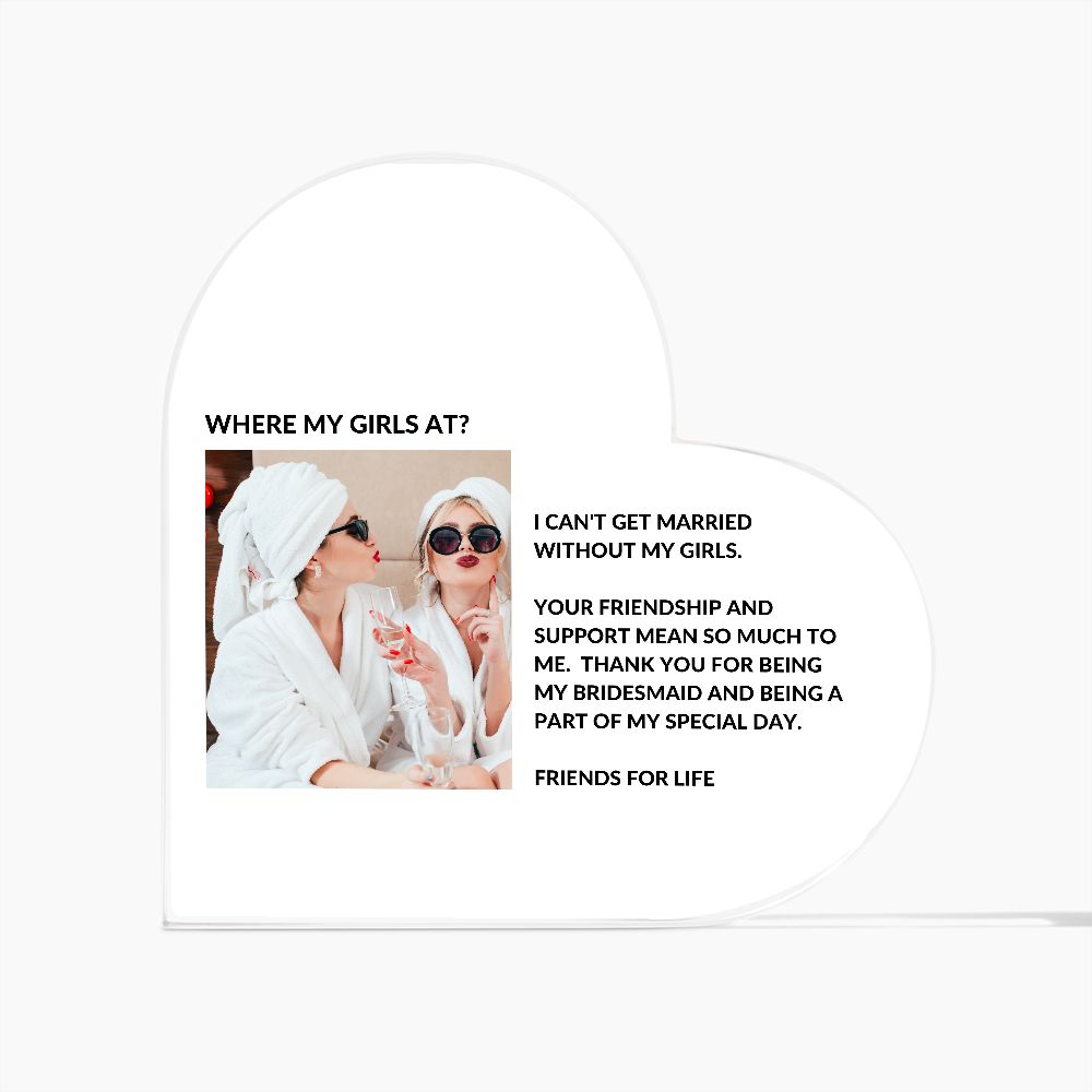 Show your bridesmaids how much you care with our Printed Heart Shaped Acrylic Plaque! Crafted with precision and care, this stunning piece of art is a perfect expression of your heartfelt emotions. Made from premium quality acrylic, it boasts a crystal-clear finish that catches the light, adding a touch of elegance to any space. The vibrant printed design creates a unique gift giving experience that will leave your special someone speechless! This is the ideal present. Purchase one today for each bridesmaid!